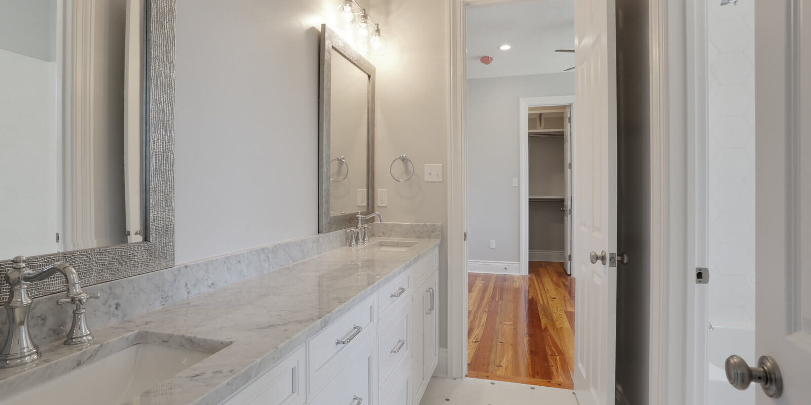 Take a view into this jack and jill secondary bathroom remodel that features wall to wall custom white shaker cabinets mounted with beautiful Carrera marble. Oversized chrome textured mirrors with matching timeless plumbing fixtures and lighting make this renovated space feel revived. Penny tiles adorn the floor leading to the water closet and shower.